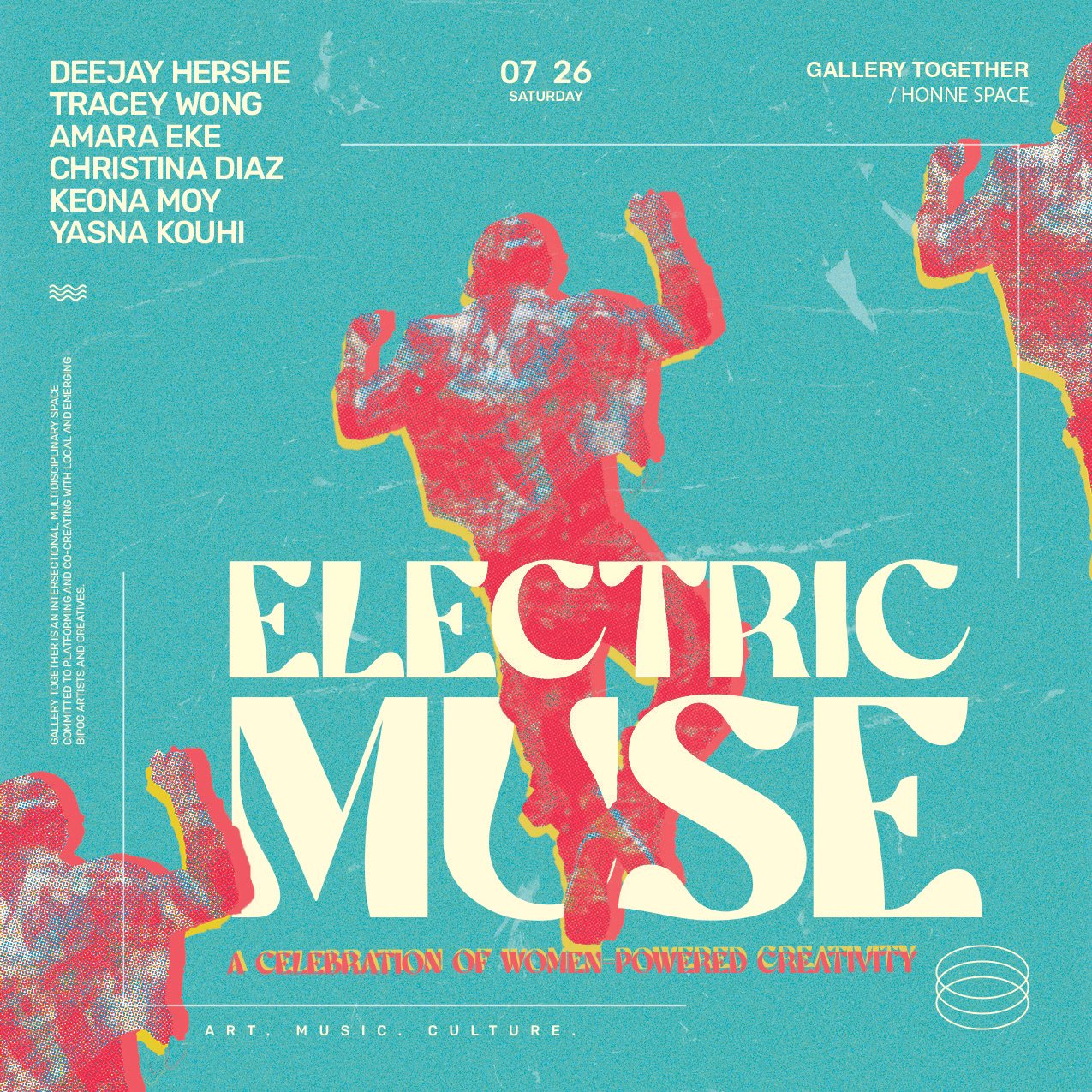 "Electric Muse" is a celebration of women-powered creativity—where sound, color, and spirit take center stage. Rooted in the boldness of funk, the freedom of self-expression, and the unapologetic joy of playful art, this is a tribute to the fierce, femme-driven forces shaping art and culture.