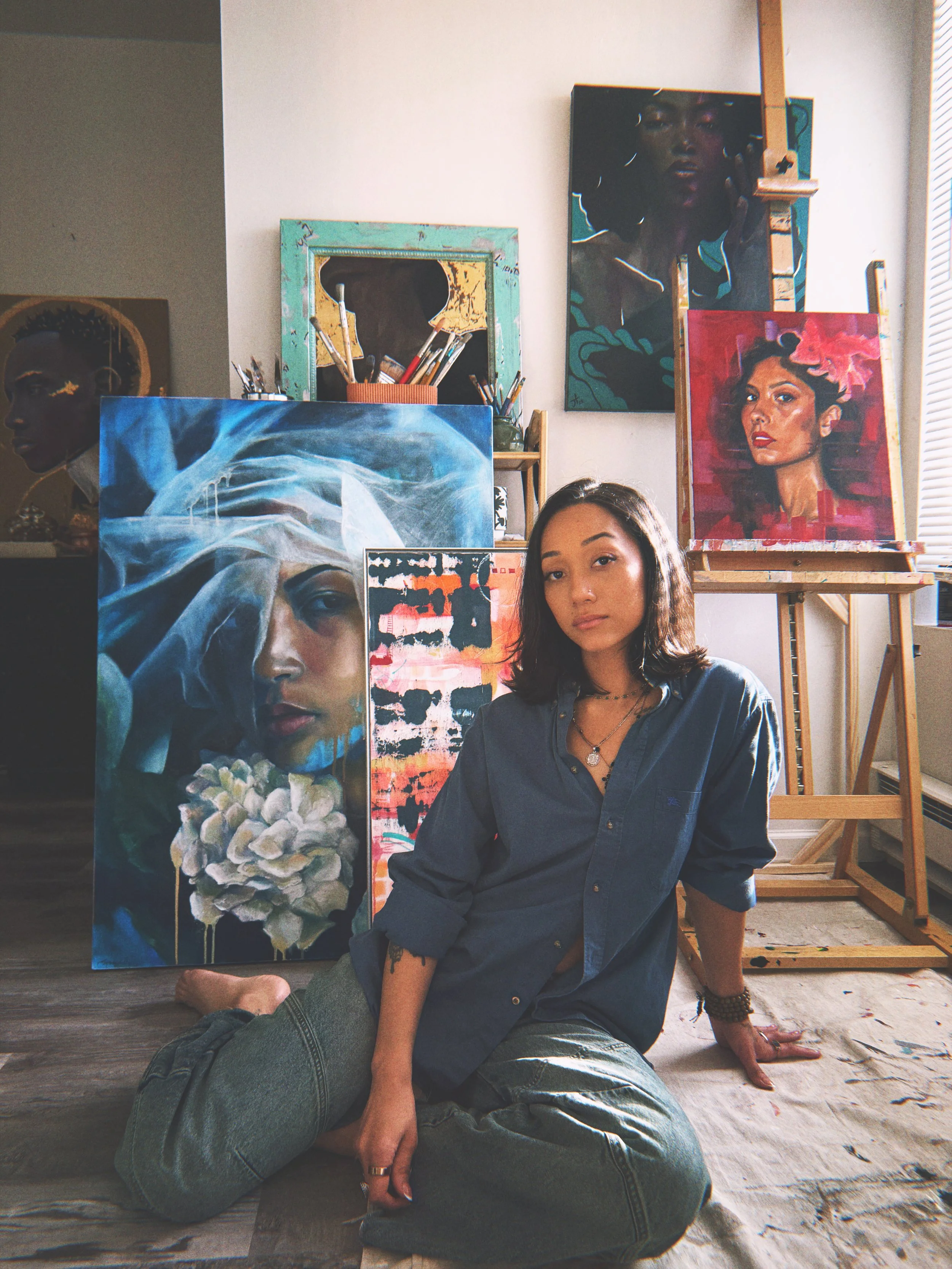 Working across portraiture and abstraction, her practice moves between refinement and rawness, capturing both the composed exterior shaped by perception and the freer, more intuitive inner self beneath the surface.